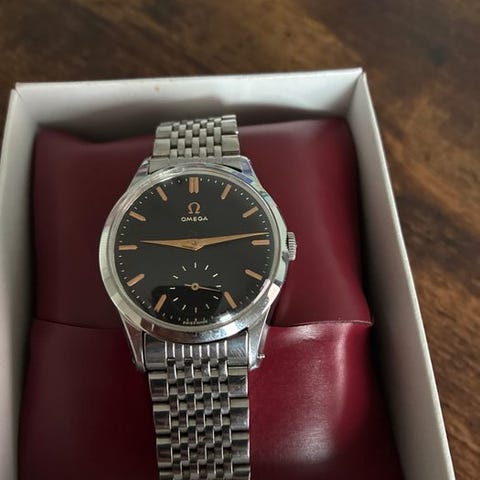Omega De Ville Chronograph, reference 145.005-67, fra 1967, håndoplagt Omega calibre 321-urværk. Klik på den blå "gå til varen" knap, for at købe eller byde på denne vare. Den samlede pris vil blive vist inden du afgiver dit bud.