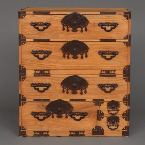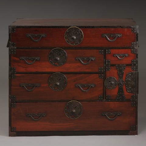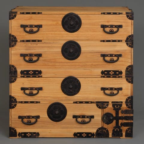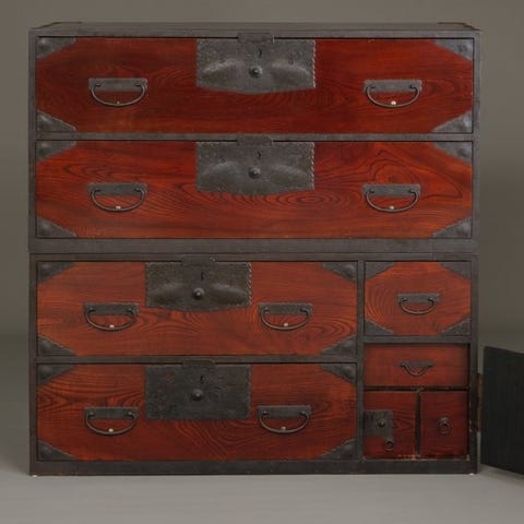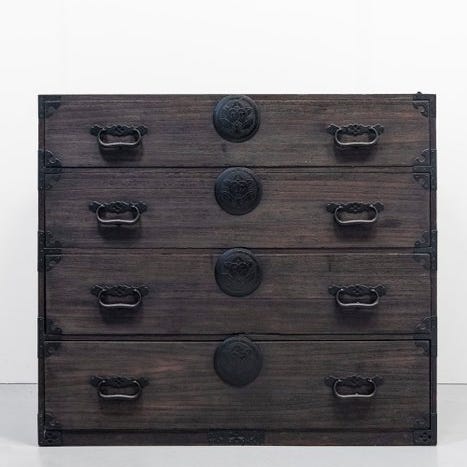 Skuffefronterne er fremstillet af indfødt hinoki-cyprestræ. Toppen, fronten og siderne er lakeret med en skinnende sort lak.