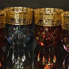 En rig dekoration udført strengt i Pantografo broderi, der broderer hele den øverste del af glasset, og generøse penselstrøg af rent guld beriger det yderligere.