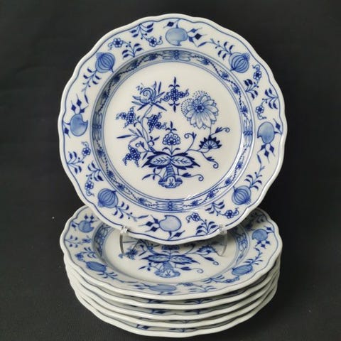 Velkommen! Vi præsenterer et sæt tallerkener til 6 personer, elegant med motiv af blå løg fra Meissen, det 20. århundrede.