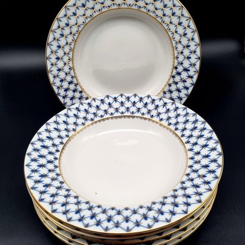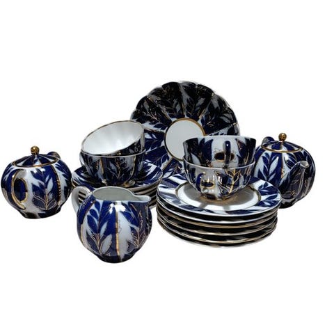 Originalsættet af porcelæn fra Imperial Porcelain Factory, Sankt Petersborg (Lomonosov), forsynet med det klassiske, genkendelige verden over mønster 'Winding Twig' i kobalt og guld.