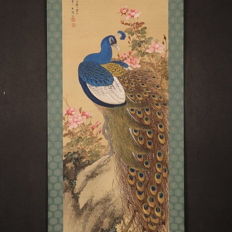 Meget flot maleri 'Bird and rose' af Shoda Kakuyu (1879–1948), håndsigneret, fra Japan, dateret til 1920'erne, med originalt signeret tomobako og nijubako, samlede rulleformat 206 × 55 cm (billedet 116 × 41 cm), i god stand. Klik på den blå "gå til varen" knap, for at købe eller byde på denne vare. Den samlede pris vil blive vist inden du afgiver dit bud.