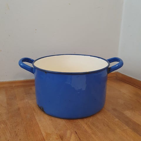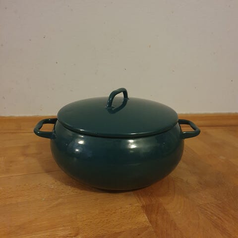 Fremstillet i holdbart metal med en tyk emaljeret belægning og hvide indre dele, komplet med håndtag og låg i krommet metal.