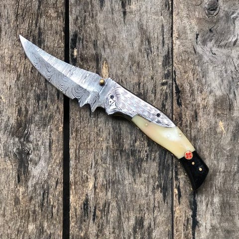 Hvert kniv har et betagende mønster af 1095/15N20 Folded Steel, skabt ved at folde højkvalitets kulstofstål for enestående skarphed, kantbevarelse og holdbarhed. Den bølge-lignende åre tilføjer en unik æstetik, hvilket gør hver kniv til én af sin slags.
