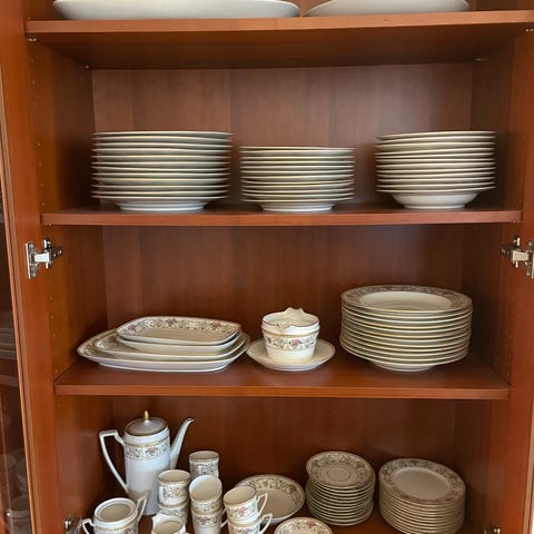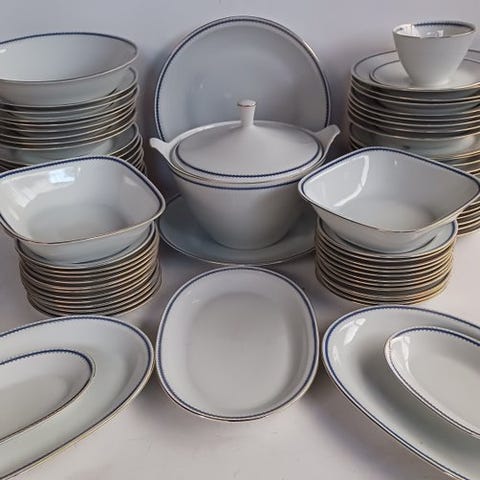 13 frugttallerkener, 12 dybe tallerkener, 11 flade tallerkener, 2 lange gafler, 1 suppeterrine, 7 frugtkopper, 1 kop, 12 desserttallerkener, 1 kaffekande, 1 mælkekande, 1 sukkerkrukke, 1 tekande, 9 underkopper, 9 kopper, alle i perfekt stand.
