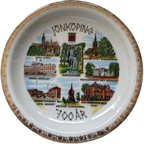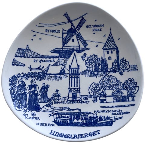 Super fin hvid platte med mørkeblå stregtegninger, som viser Vinkelgården på Frilandsmuseet Hjerl Hede.