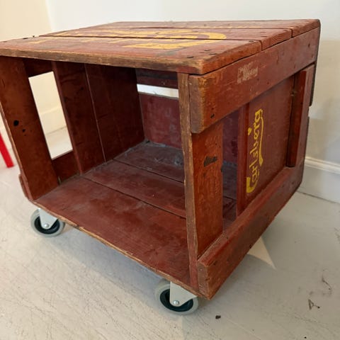 Fed gammel retro vintage ølkasse med hjul som er blevet brugt som tvbord - sengebord og opbevaring