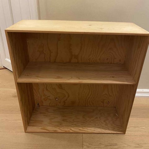 To styk dybe bogkasser der passer til vinyler eller mega dybe bøger. Kasserne er malet i en fin blå farve. Den ene kasse har hul i bagklædningen til kabelgennemføring da de har været brugt til at huse stereoanlæg. Ophæng medfølger.