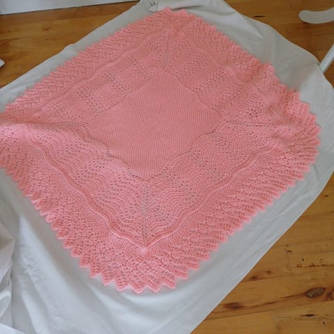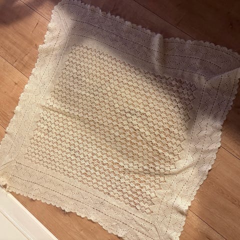 Aldrig brugt, men har ligget fint i en kasse i pose, derfor en smule krøllet. Er kun vasket i hånden efter strikket færdig. 100% baby uld.