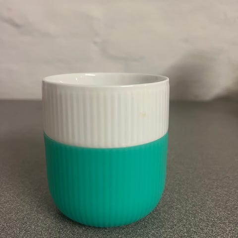 Royal Copenhagen kop med tofarvet design i hvid og støvet turkis. Koppen har et rillemønster og er egnet til servering af varme drikke.