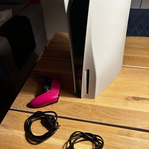 Playstation 5 spillekonsol med tilhørende controller og nødvendige kabler til tilslutning og opladning. Konsollen har et moderne design og leverer spiloplevelser i høj kvalitet.