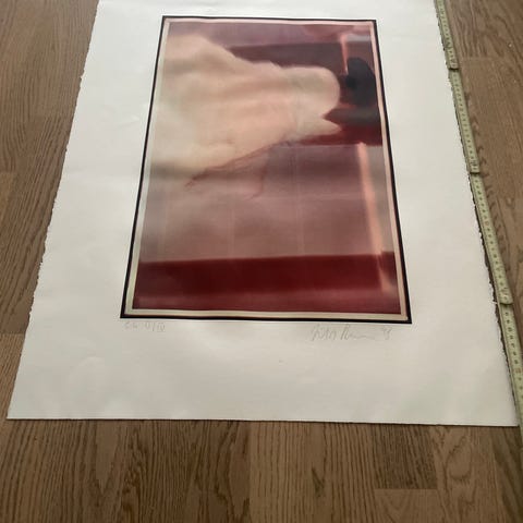 Litografi med abstrakt motiv i grønne og brune nuancer. Motivets detaljer inkluderer menneskelignende figurer og dynamiske linjer. Nummereret 79/150 i nederste venstre hjørne. Indrammet med glas og hvid ramme. Velegnet til dekorativ ophængning.