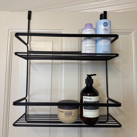 Sort metal hyldereol med to hylder til fx cremer. Der kan hænges et eller flere håndklæder fast på det sidste niveau.