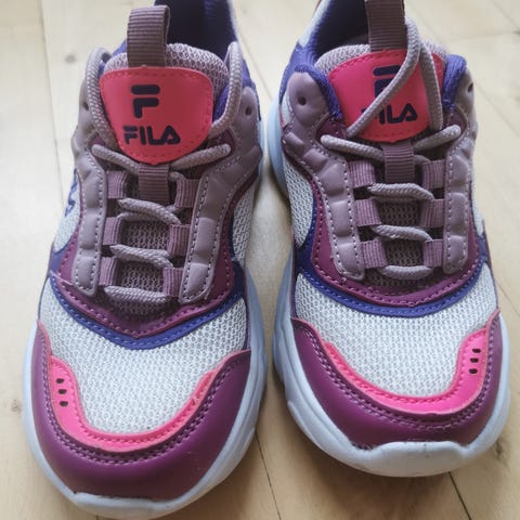 Fila børnesko i størrelse 33 til pige. Skoene har en kombination af farver, herunder lilla, gul og lyserød, med en hvid sål og velcrolukning.