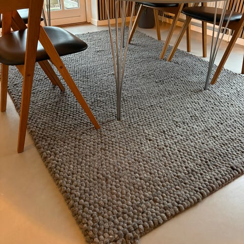 Hay tæppe med kugleformet struktur og mønster. Tæppet har en kombination af grå og lyserod farver, der danner et geometrisk mønster.
