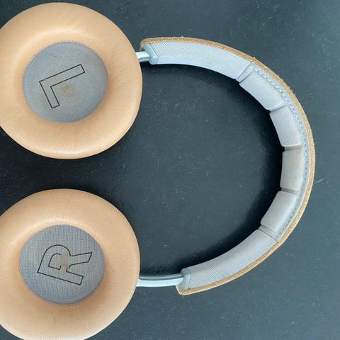 Bang & Olufsen hovedtelefoner over-ear med tilhørende kabler. Hovedtelefonerne har en polstret bøjle og ørepuder, der dækker hele øret. Materialerne inkluderer metal og polstret stof. Produktet er designet til lydafspilning og kan tilsluttes via de medfølgende kabler. Den ene ørepude er løs, men de virker som de skal. De er også trådløse, så de kan lades op med tilhørende kabel