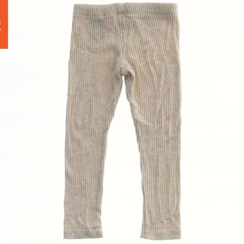 Børnebukser i en grøn farve med elastik i taljen og ribkanter ved anklerne. Bukserne har flere lommer, herunder to store lommer på siderne og to mindre lommer bagpå.