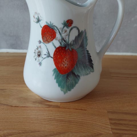 pillivit pillyvit pillivyt pillivut porcelæn jordbær jordbærmønster mønstret Eden decor bistro køkkentøj Fransk pillivit pillivyt Cafe Gourmandise dekoration porcelæn frugt grønsager flødekande vandkande