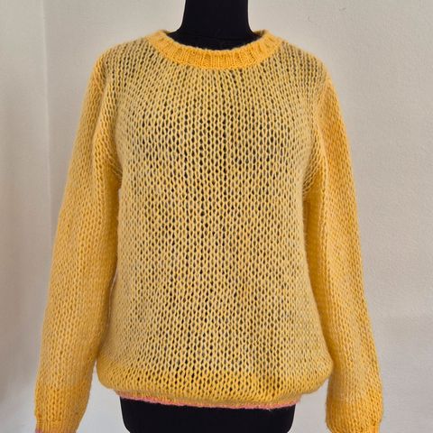 Fineste strik, halvlang med lommer og knapper ned af ryggen. Farven på billedet snyder. Den er helt sort. Meget fin.