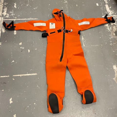 Sælger en overlevelsesdragt i størrelse M / L, velegnet til sejlads, offshore-arbejde eller som sikkerhedsudstyr på vandet. Dragten er designet til at give varme og beskyttelse i kolde og krævende forhold.