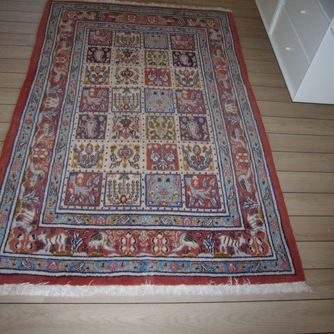 Fint firkantet ægte tæppe i meget fine varme farver, måler 150 x 150. Tæppet fremstår helt uden brugsspor. Har ligget i røgfrit hjem og hjem uden kæledyr.