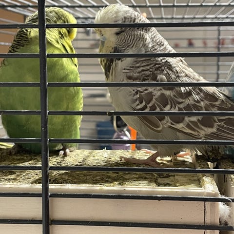 To engelske Undulater til salg med stort bur og diverse. Hannen synger flot ,og er meget stor af en Undulater at være.250 kr. 52250781.