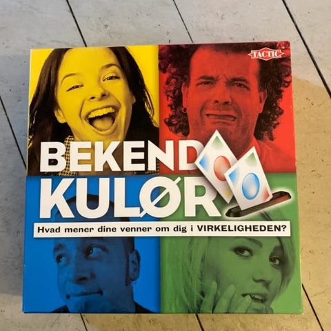 Tactic Bekend Kulør brætspil med kort og spilleplade. Spillet fokuserer på at gætte farver og indeholder flere spillekort og brikker. Egnet til brug som familiespil eller i sociale sammenhænge.