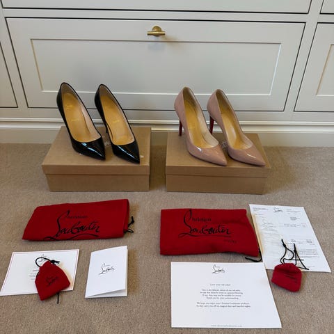 Skoene har en glitrende overflade med flere farver og den karakteristiske røde sål. Læder og glimmer.