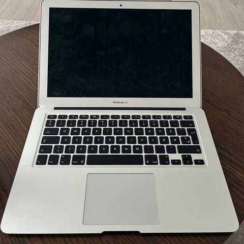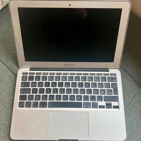 Apple MacBook Air laptop i sølv farve. Den er fra 2014 og har et liiiidt sløvt batteri, men ellers fin
