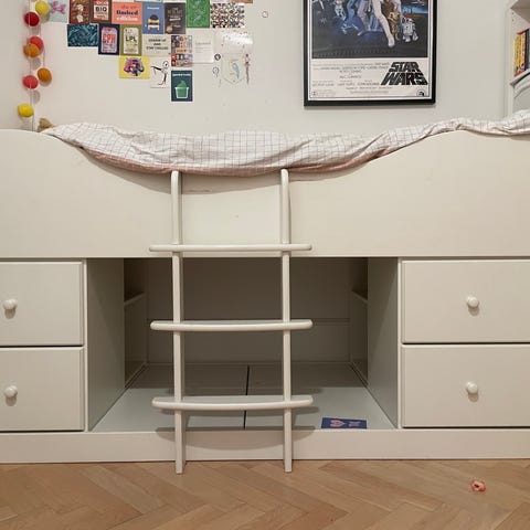 Sengen er 90 x 200, og er kan derfor “vokse” med barnet. Den har enkelte skrammer, men fejler absolut intet!