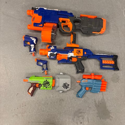 Nerf legetøjspistoler og geværer i forskellige størrelser og farver. Sættet indeholder flere modeller med forskellige designs og funktioner, egnet til børn til leg og udendørs aktiviteter.
