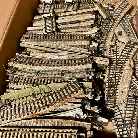 Klassiske Märklin M-skinner (H0) model 3601D ( I dag går de under model 5106 ). Pakken indeholder lige skinner med gennemgående midterleder.