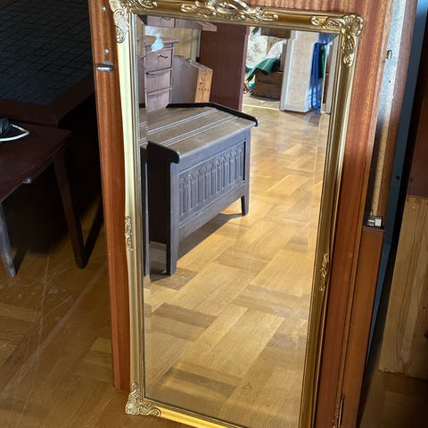 Rustik spejl. Nogle steder har spejlet fået nogle skræmmer, disse ses dog ikke så tydligt. Spejlet er tungt. Ca 140 cm langt