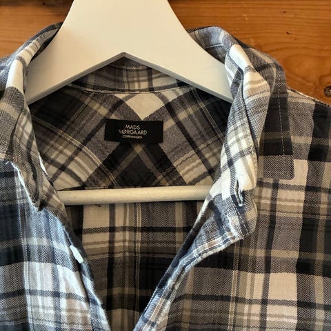 Mads Nørgaard skjorte i blå farve, størrelse 6 år (116/122) til dreng. Fremstillet i bomuld. Skjorten har lange ærmer og knaplukning foran. Som ny. Obs på den lille svage farvede plet.