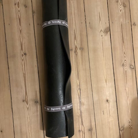 Dette er en grå yogamåtte med en størrelse på 118x55 cm. Måtten har en ribbet tekstur, der giver godt greb under brug.
