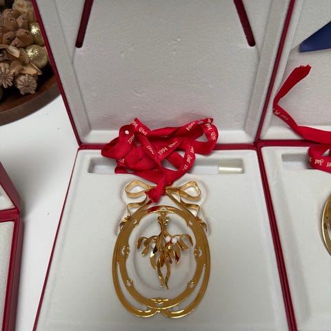 Dette er et Georg Jensen juleornament, designet som et glansfuldt hjerte. Ornamentet er lavet af metal med guld finish og har en indgravering af en svamp på forsiden. Det kommer med to farvede bånd, et rødt og et grønt, til ophæng og er pakket i en original Georg Jensen kasse. Ornamentets størrelse er 5,5 cm.