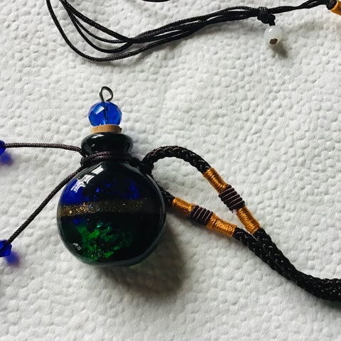 Rigtig sød halskæde med en lille flaske i tykt MURANO GLAS. Farven er turkisblå med guldstriber og pynteperler i matchende farver. Proppen kan tages af og flasken evt. fyldes med duftevand. Vedhænget er 3x4 cm og de fleksible brune snører kan ialt blive 62 cm. Smykket er helt nyt. OPRYDNINGSPRIS