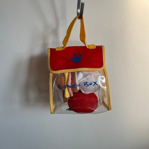 En lille taske i blå og gul med et justerbart skulderrem. Tasken har Build-A-Bear logo og bærer et enkelt poteaftryk design. Passer til små essentielle ting og er ideel til børn eller til en Build-A-Bear bamse. Den har en lukning foran med velcrolås omkring logoet.