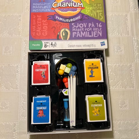 Cranium er et dansk udgivet brætspil, der engagerer spillere i flere aktiviteter inklusiv skuespil, kunst, ord og vidensudfordringer. Boksen indeholder spilkort, spilleregler, blyanter og andre nødvendige elementer for at spille spillet, designet til 4 spillere eller flere og passer til teenagere og voksne. Spillet tager cirka en time at gennemføre og er ideelt til familiesammenkomster og fester.