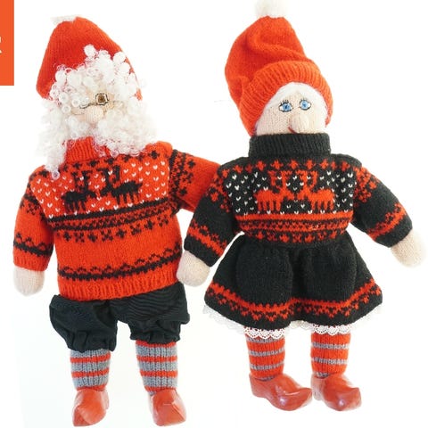 En nissefigur, som virker til at være lavet af keramik eller et lignende materiale. Figuren er ca. 8,5 cm i størrelsen og har stribede røde og grå dragter med en rød nissehue. Figuren kan bruges som en dekoration i hjemmet, især i julesæsonen.