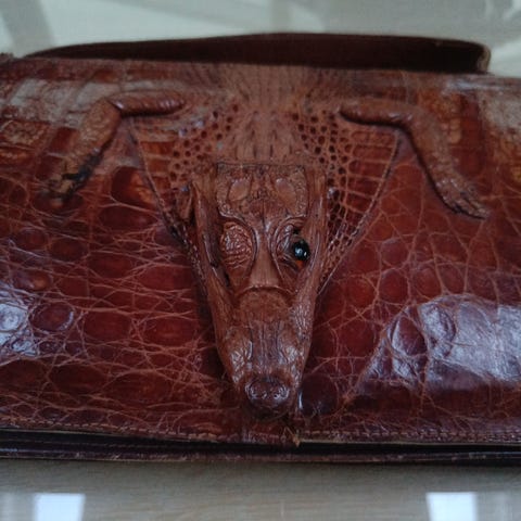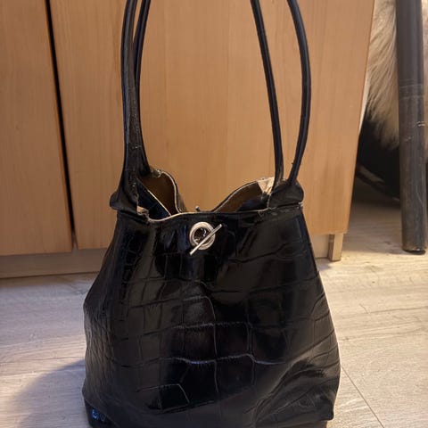Flot taske i lakeret kernelæder med krokodilleskinds look, ingen indvendige rum, men en tilhørende lille taske med lynlomme til værdigenstande. God men brugt. Købt ved en taskemager (håndlavet) i Australien for 5000 DDK/1000AUD. Prisen er fast/min.
