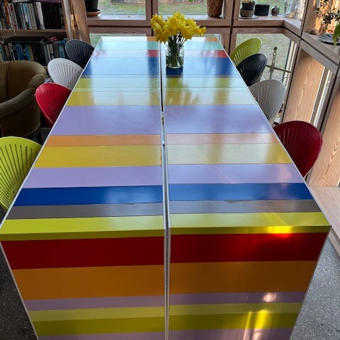 Stolene har synlige brugsspor og afskalninger på malingen flere steder. Det ene sæde er gået i stykker men et nyt kan købes hos forhandler.
