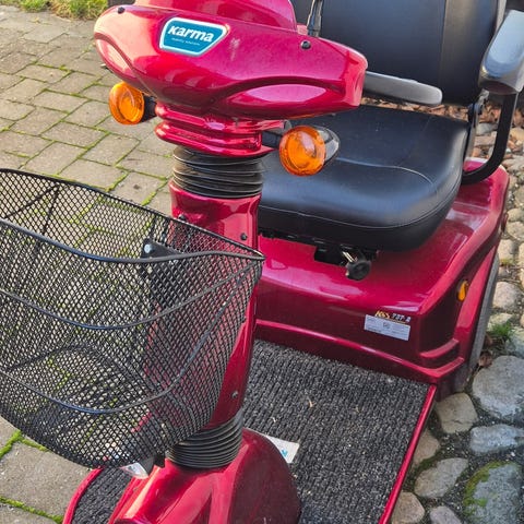 Karma El Scooter i blå farve. Kørestolen har fire hjul, justerbart sæde med armlæn, kurv foran til opbevaring og kontrolpanel med batteriindikator. Egnet til personer med nedsat mobilitet til udendørs brug. Nedslag for hurtig handel og afhentning.