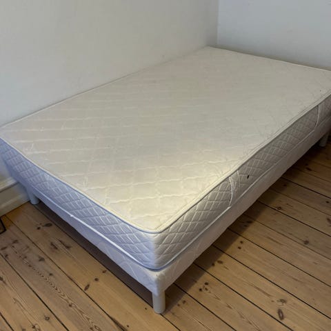 Ilva madras (fra det "gamle Ilva i Lyngby") med fast fjederindlæg og hvid betræk,ramme i træ. Størrelse 70x190 cm. Monter 4 ben og det er en seng