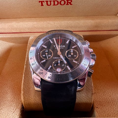 Tudor herreur med sort urskive og sort rem. Uret har en rund urskive med tydelige markeringer og roterende krans. Designet til mænd.