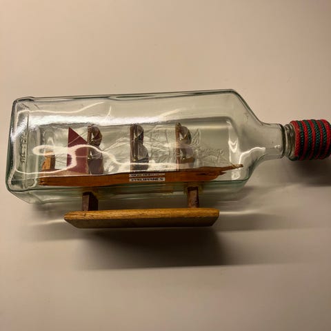 Denne genstand er en flaske, der indeholder en miniature skibsmodel. Flasken er lavet af glas og har en korkprop på toppen. Inde i flasken er der en træstruktur, som minder om et skibs rigging system, og en papirstrimmel med teksten 'Glædelig jul'. Flasken er 21 cm høj og har en fladt bund for stabil placering.