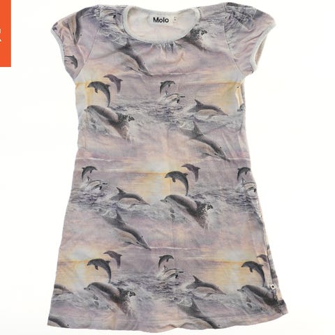 Kjolen har en overdel i grå med lange ærmer og en farverig nederdel med et hesteprint. Kjolen er fra mærket Molo og er størrelse 128.