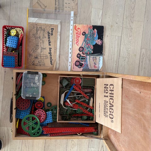 Meget gammelt Tekno ingeniør sæt med rigtig mange dele. Det er fra den tid hvor man ikke havde meget legetøj, så dette har været flittigt brugt, deraf brugsspor. Prisen er sat derefter.