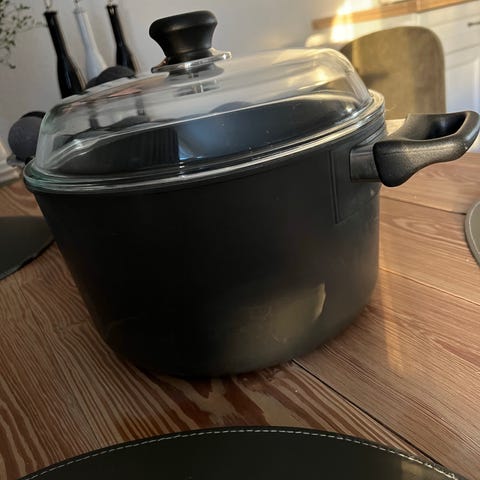 En nyrenoveret svensk vintage støbejerns gryde fra svenske Skeppshult der kan indeholde 3 liter.