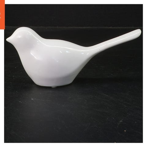 Dekorativ figur formet som en lille fugl med en strikket hat og fjer omkring halsen. Fuglen er detaljeret med tekstur på vingerne og halen. Størrelsen er 13x14 cm. Der er en etiket med produktnummer på bunden af fuglen.